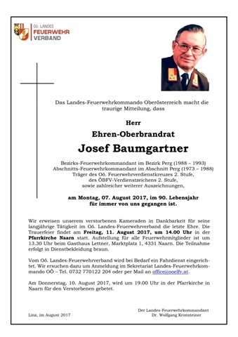 Unter großer Anteilnahme der Feuerwehren des Bezirkes fand am Freitag, den 11. August das Begräbnis von Ehren-Oberbrandrat Josef Baumgartner statt.