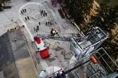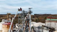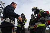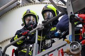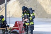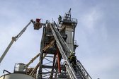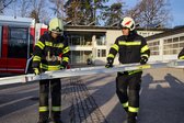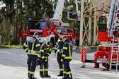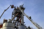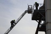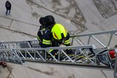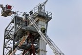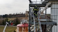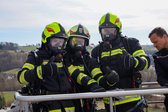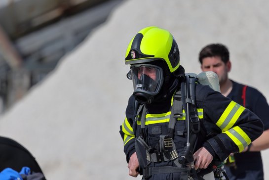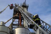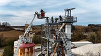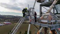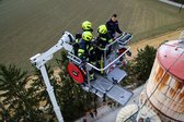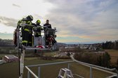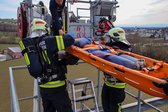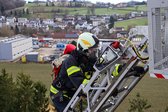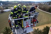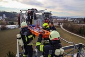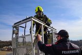 Auf 28 Meter Höhe erhielten die Einsatzkräfte eine kurze Vorstellung für den sicheren Umgang mit dem Korb der TMB Mauthausen. Danach folgte eine kleine Übung zur Rettung einer verletzten Person, die in den Korb der TMB verbracht wurde. Zusätzlich wurde das Umsteigen in den Korb unter Atemschutz sowie die Fremdversorgung mit Atemluft geübt.