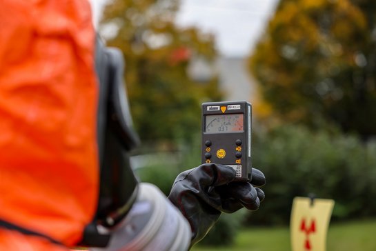 Bei der zweiten Station stand ein Laborunfall im Mittelpunkt. Hierbei wurde ein bewusstloser Labormitarbeiter von einer Reinigungskraft aufgefunden. Die Einsatzkräfte durchsuchten das Labor auf nuklide Stoffe, lokalisierten diese und sperrten den Bereich abAuch die betroffene Reinigungskraft wurde mithilfe der ADK-K/Flächensonde auf mögliche Kontamination überprüft.