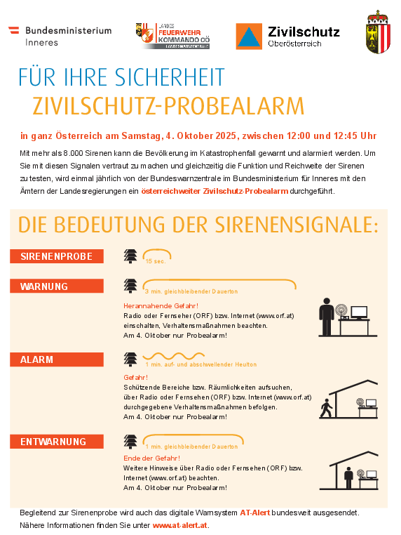 Ăsterreich verfĂŒgt ĂŒber ein gut ausgebautes Warn- und Alarmsystem, das vom Bundesministerium fĂŒr Inneres gemeinsam mit den Ămtern der Landesregierungen und den Landes-FeuerwehrverbĂ€nden betrieben wird. Ăsterreich ist somit als eines von wenigen LĂ€ndern in der Lage, eine flĂ€chendeckende Sirenenwarnung ĂŒber mehr als 8.300 Zivilschutzsirenen abzustrahlen. In Oberösterreich werden 1.430 Sirenen getestet.